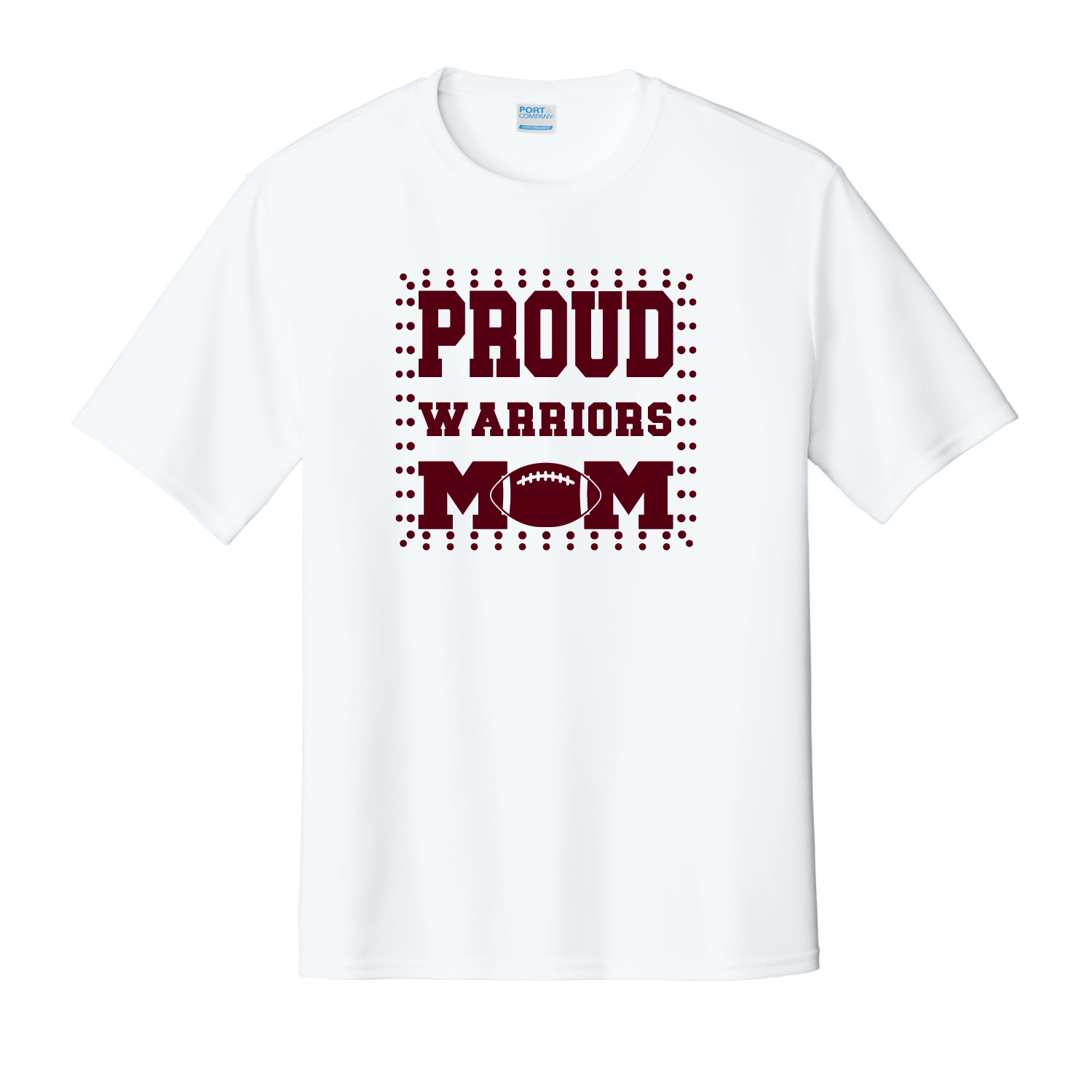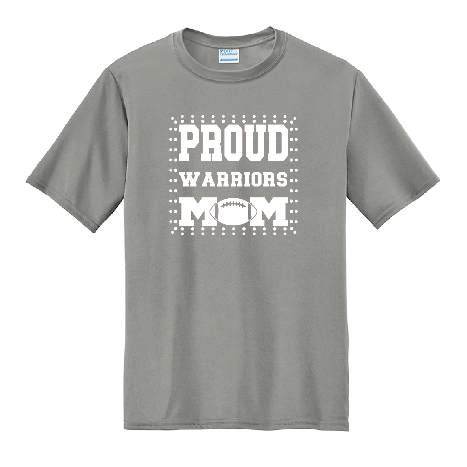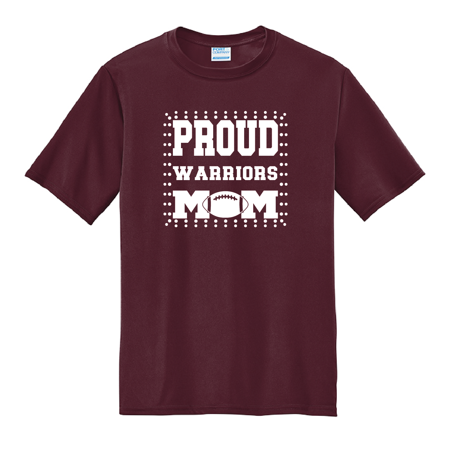 “PROUD WARRIORS MOM” printed on center chest. Options include